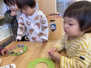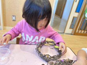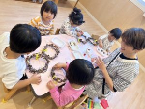 小さな手で飾りを摘まむ真剣な表情や、出来上がったリースを