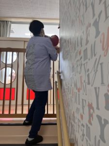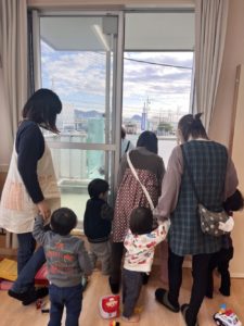 保育士と手を繋ぎ、慌てる様子もなくベランダへ