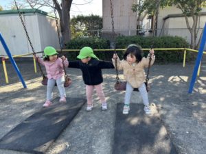 ブランコで遊んでいるお友達の背中をそっと押してあげる